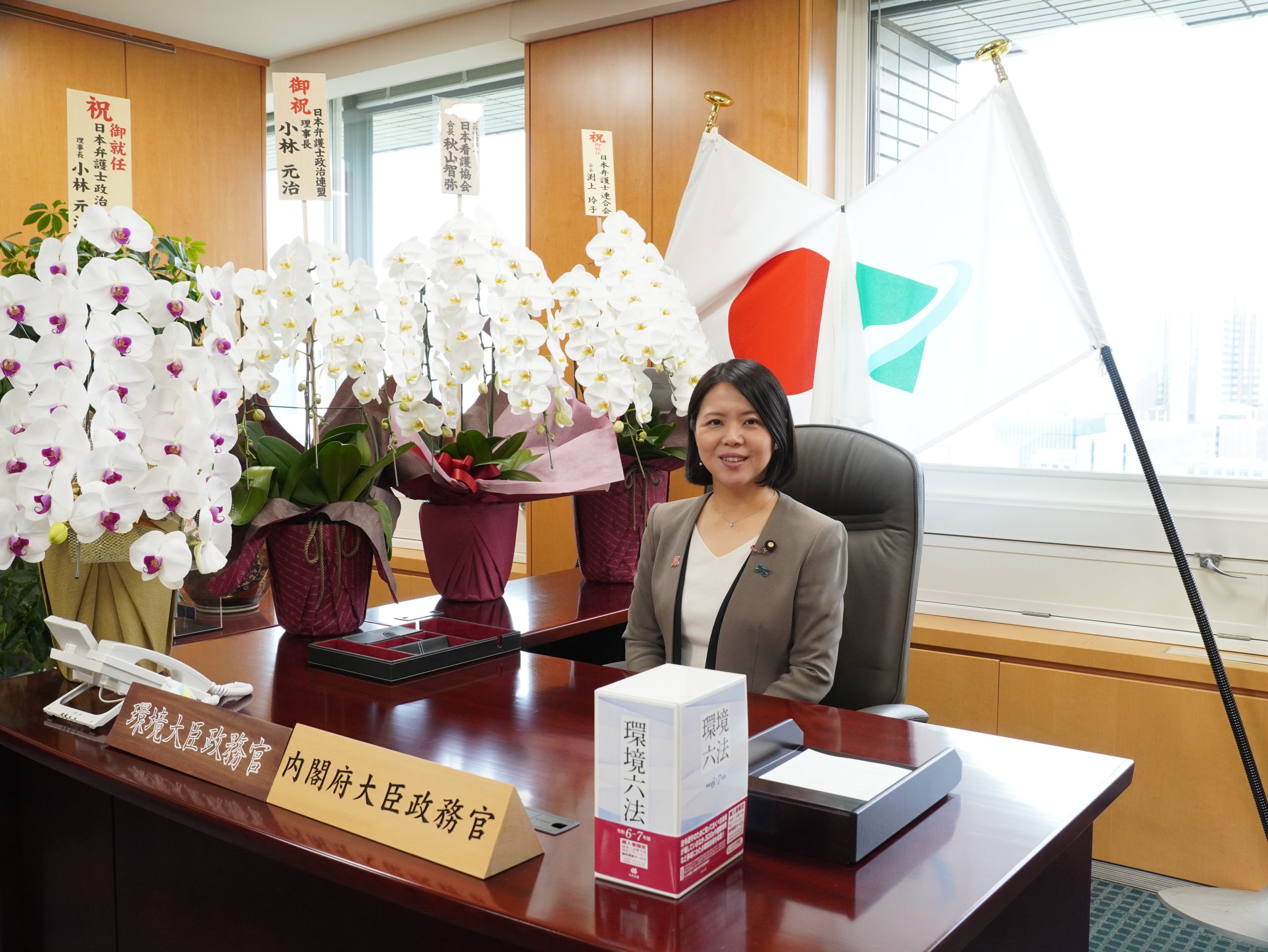 友納りお議員が環境大臣政務官兼内閣府大臣政務官に就任されました!ますますのご活躍を期待しております。(写真は政務官室での友納議員です)