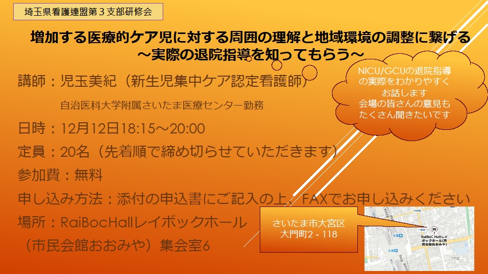 第3支部研修会「増加する医療的ケア児に対する周囲の理解と地域環境の調整に繋げる~実際の退院指導を知ってもらう~」