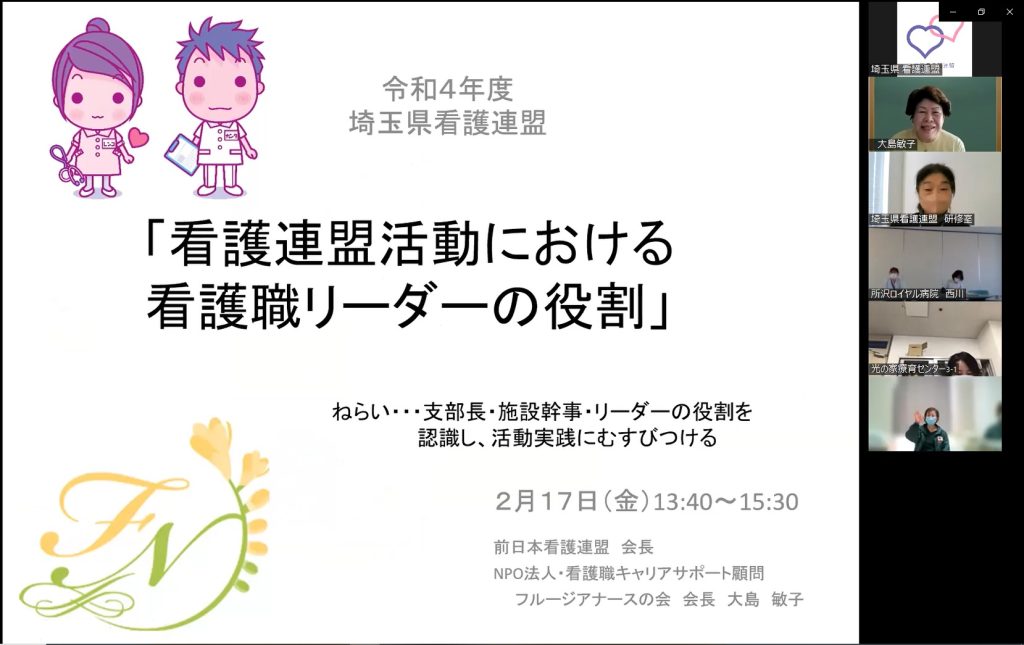 | 講 師 | 「連盟活動におけるリーダーの役割」 前日本看護連盟 会長 大島 敏子 氏 |